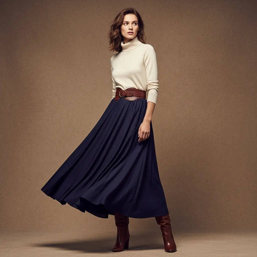 Embrace the feminine side of fall fashion with a maxi skirt outfit that celebrates the season’s rich color palette. Choose a maxi skirt in a fall-appropriate pattern or solid color—velvet, plaid, or deep jewel tones all work beautifully. Pair this with a fitted turtleneck or form-fitting long-sleeve top in a complementary neutral shade like cream, black, or charcoal. Add knee-high boots and a structured belt at the waist to define your silhouette. This outfit works exceptionally well for creating an elongated silhouette while embracing the comfort and grace that fall fashion can offer. The maxi skirt brings an element of understated elegance that elevates simple pieces and creates an outfit appropriate for both casual and slightly dressier occasions.