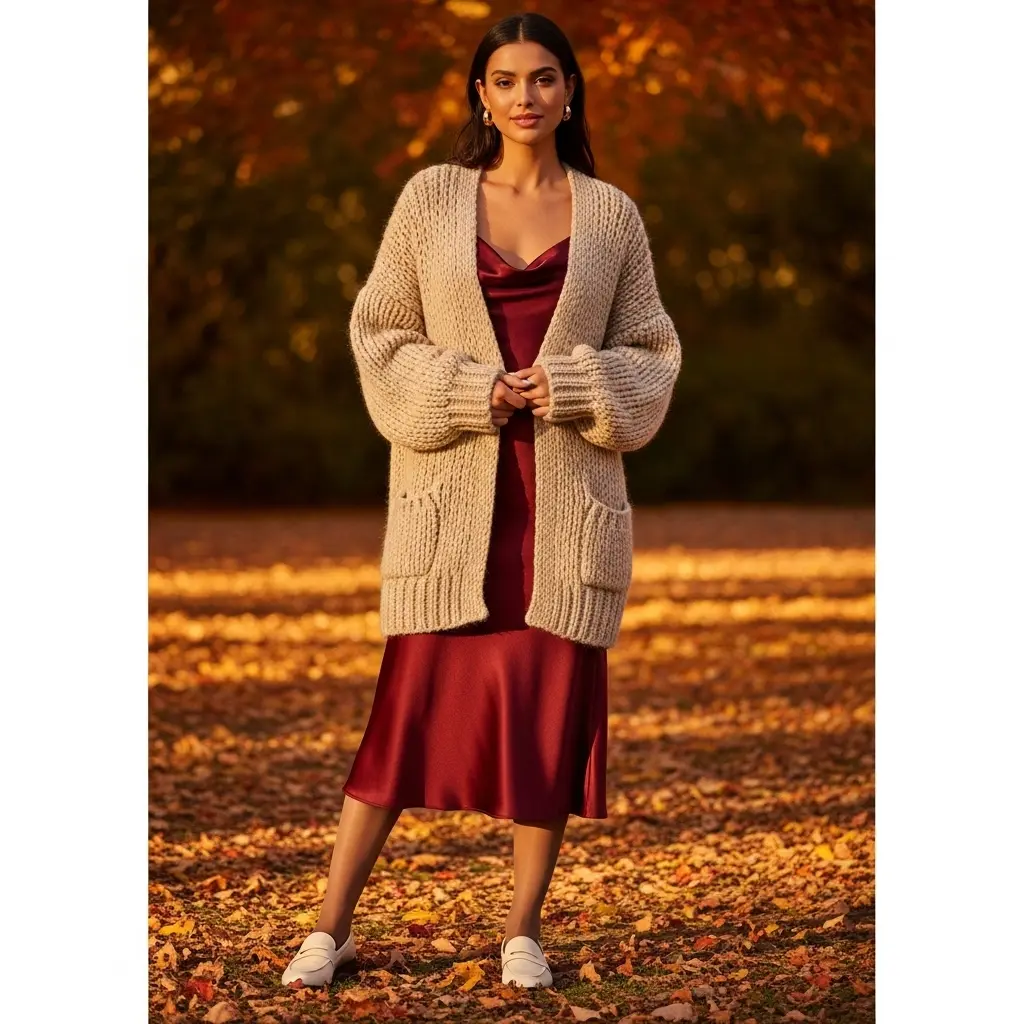 For a look that combines comfort with unexpected elegance, pair a long oversized cardigan with a slip dress. Choose a cardigan in a neutral tone like oatmeal, grey, or tan, and layer it over a satin slip dress in black, burgundy, or jewel tone. The slip dress provides a touch of sophistication, while the oversized cardigan adds comfort and a relaxed aesthetic. Add sheer tights and loafers or ballet flats to complete the look. This outfit beautifully captures the balance between cozy and chic that defines fall fashion, making it perfect for transitional weather when you want layering options. The oversized silhouette remains on-trend while the slip dress underneath ensures the outfit feels polished and intentional rather than accidentally casual.
