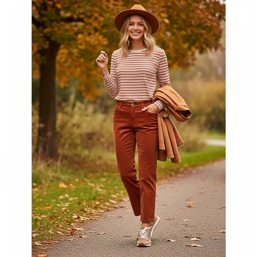Corduroy is a quintessential fall fabric that brings texture and warmth to any outfit. Pair corduroy pants in a classic fall shade like rust, forest green, or chocolate brown with a simple graphic tee or striped long-sleeve shirt. The beauty of corduroy is that it feels inherently autumnal while remaining versatile enough to pair with various tops. Add a light jacket or sweater layer, and finish with sneakers or casual boots. This outfit perfectly captures that effortlessly cool fall aesthetic that many people strive for. The corduroy provides visual interest through its distinctive texture, while the simple tee keeps the overall look balanced and wearable for everyday situations. Everything you want is here