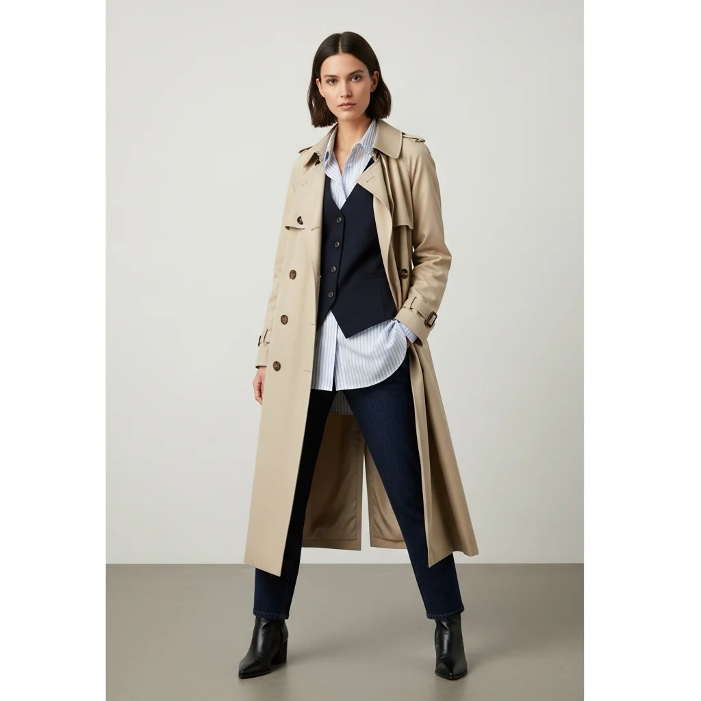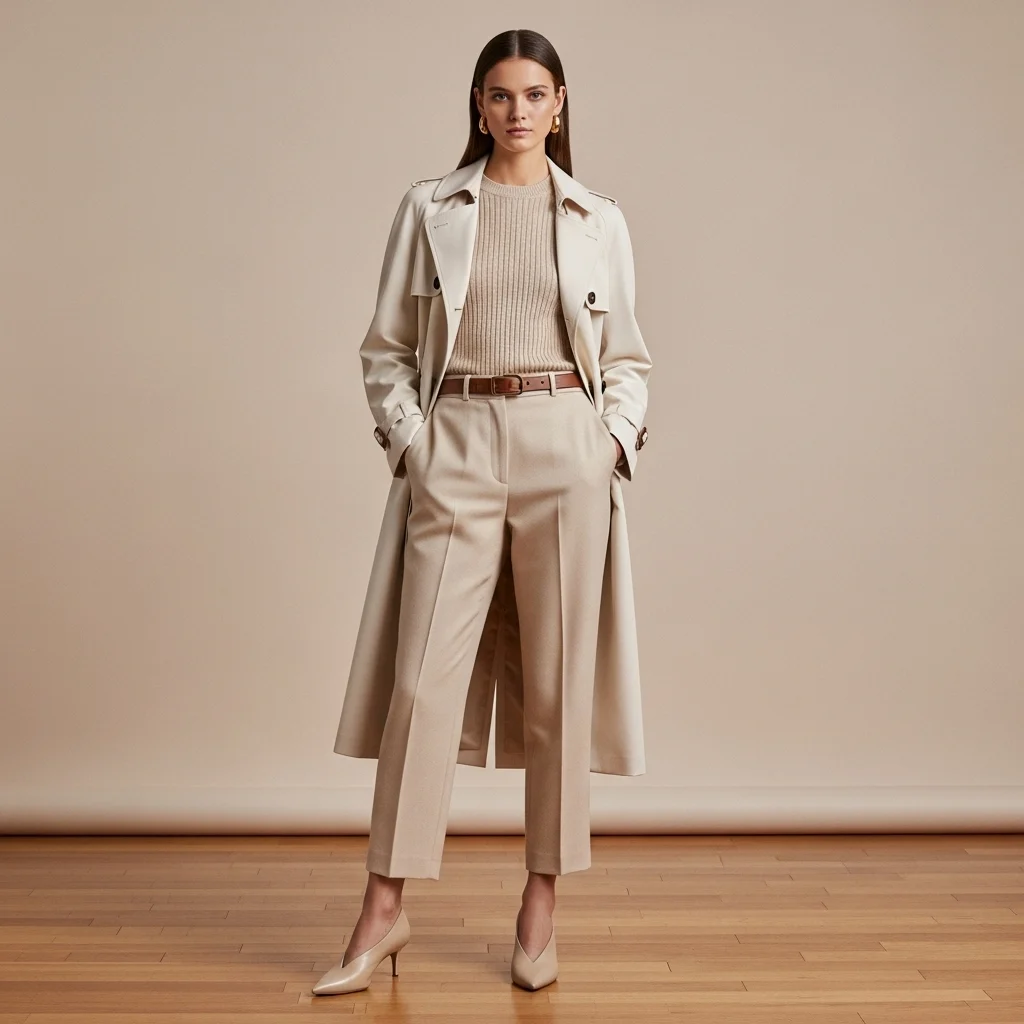 A trench coat is a sophisticated layering piece that elevates any outfit while providing practical protection from fall weather. Create a monochromatic look by pairing your trench coat with matching tones underneath—perhaps a cream trench over cream and beige pieces, or a camel trench over warm neutrals. Wear slim-fit trousers or a fitted dress in similar tones, and add pointed-toe shoes for an elongated silhouette. The monochromatic approach allows the structure and tailoring of the trench coat to become the focal point of your outfit. This look works beautifully for professional environments, upscale casual settings, or anyone wanting to channel timeless, classic elegance. The trench coat’s versatility means you can dress it up or down depending on the occasion.