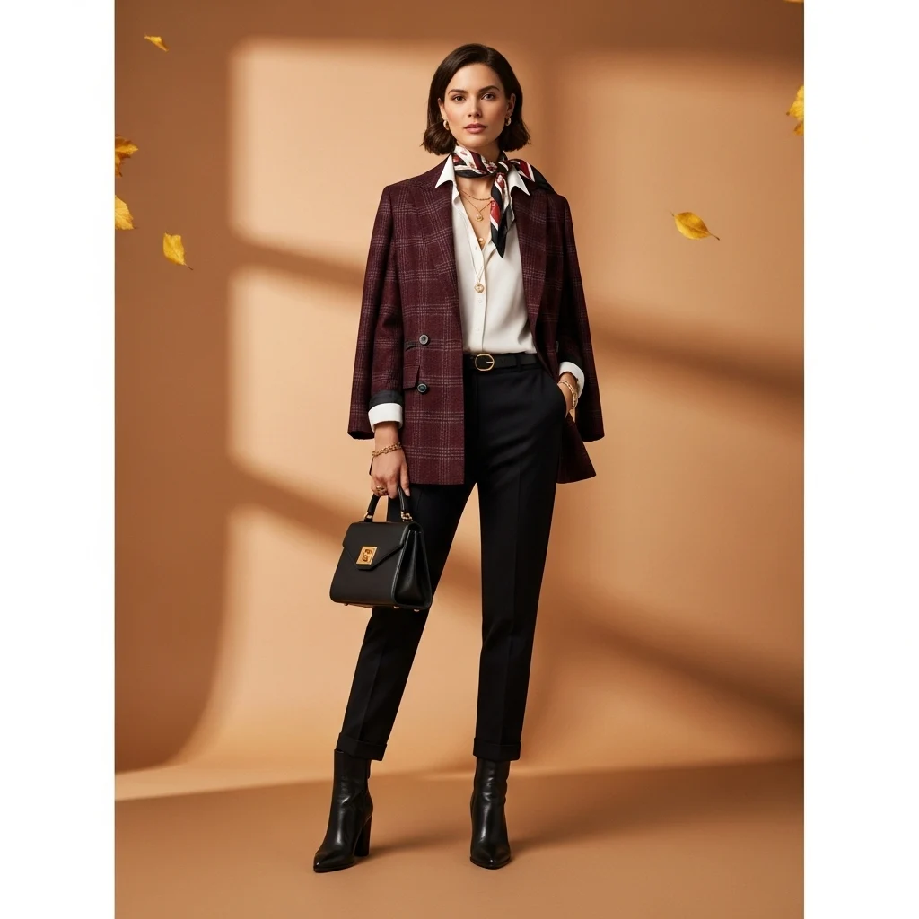 Start your fall fashion journey with a timeless plaid blazer outfit that exudes sophistication and seasonal charm. This ensemble pairs a structured wool plaid blazer in warm burgundy, navy, or burnt orange tones with a crisp white or cream button-down shirt. Layer this with fitted black or camel trousers, and complete the look with ankle boots in black leather or suede. The beauty of this outfit lies in its versatility—it works equally well for professional settings, weekend brunches, or evening events. Accessorize with a structured handbag, delicate gold jewelry, and a silk scarf to add depth and interest. This look captures the essence of fall sophistication while remaining practical and wearable throughout the season.