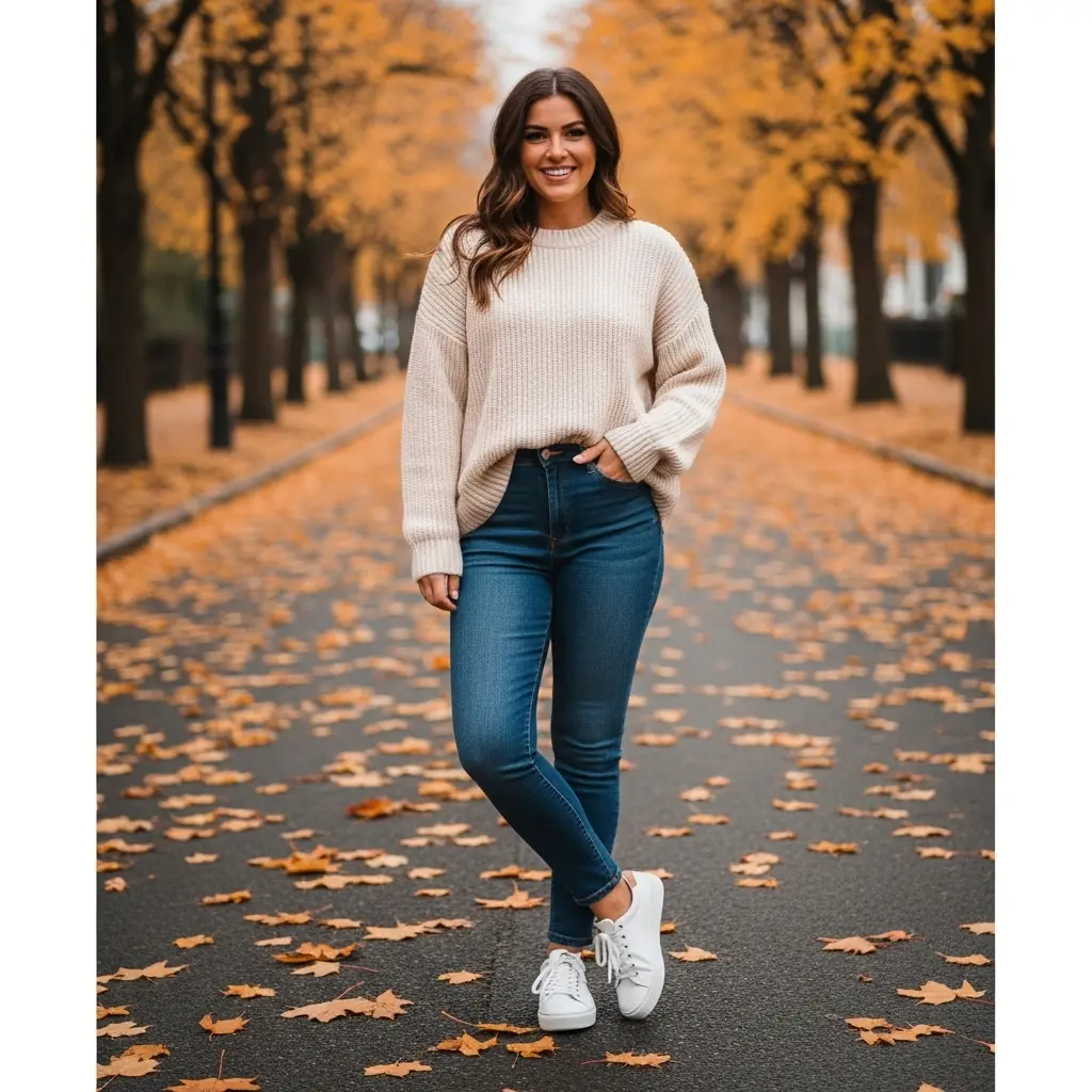 Nothing says fall comfort like a perfectly paired sweater and denim combination. Choose an oversized chunky knit sweater in cream, caramel, or forest green, and pair it with classic straight-leg or wide-leg dark denim. The contrast between the relaxed sweater and fitted jeans creates a balanced silhouette that’s both flattering and effortlessly cool. Tuck the front of your sweater slightly into your jeans for a more polished appearance, or keep it loose for an ultra-casual vibe. Add white sneakers for a casual daytime look, or transition to loafers and a structured coat for evening plans. This outfit celebrates the comfort that fall fashion allows while maintaining an undeniable style quotient.
