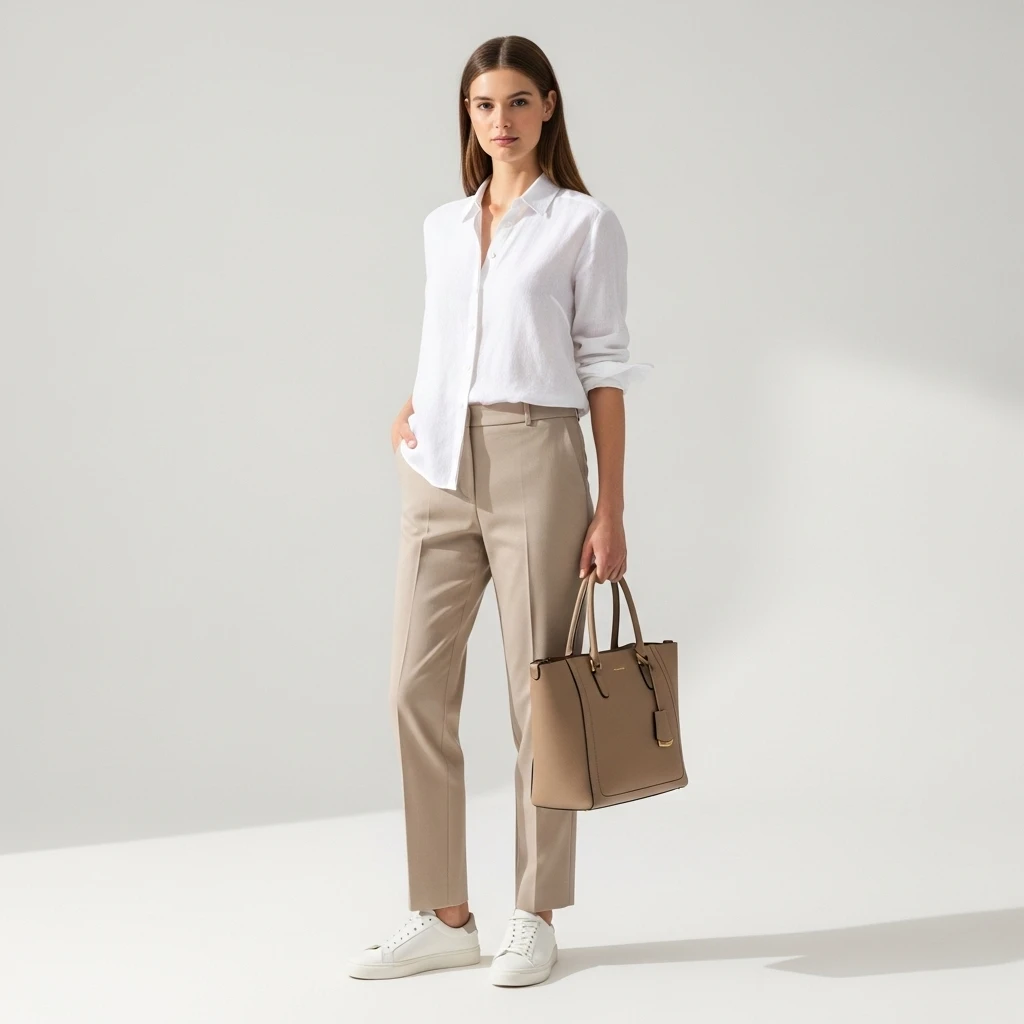 Embrace minimalism with an all-beige outfit featuring a beige sweater, matching trousers, and cream-colored loafers. Add a structured handbag in a complementary shade and delicate gold jewelry. This sophisticated look is ideal for professional settings and creates a calm, collected appearance. Monochrome outfits elongate your silhouette and create visual harmony. Varying textures within the same color family prevent the look from feeling flat or boring.