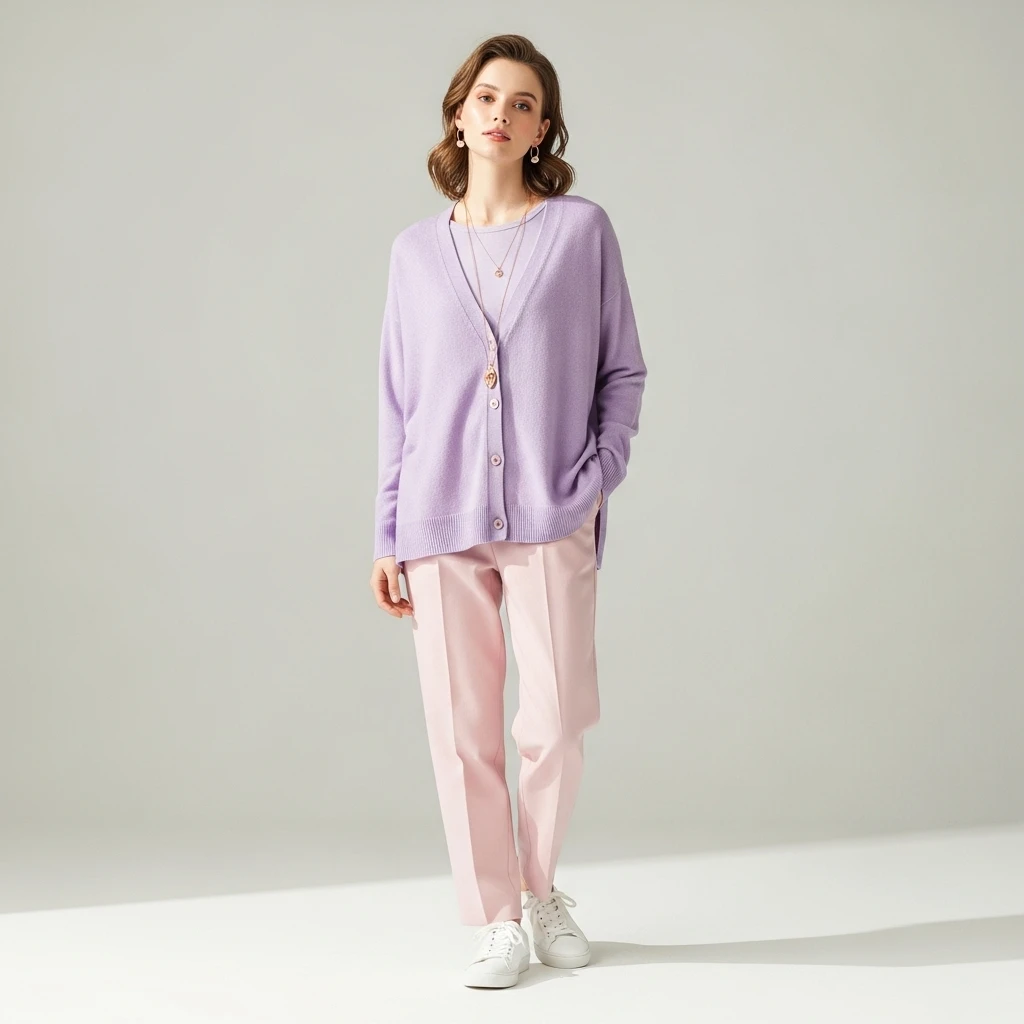 Combine soft pastels by pairing a lavender cardigan with pastel pink trousers and white sneakers. This dreamy combination is perfect for spring garden events or casual outings with friends. Pastel colors dominate 2025 fashion and offer a gentle, approachable aesthetic. Accessorize with rose gold jewelry and a light-colored crossbody bag to maintain the soft, cohesive palette.