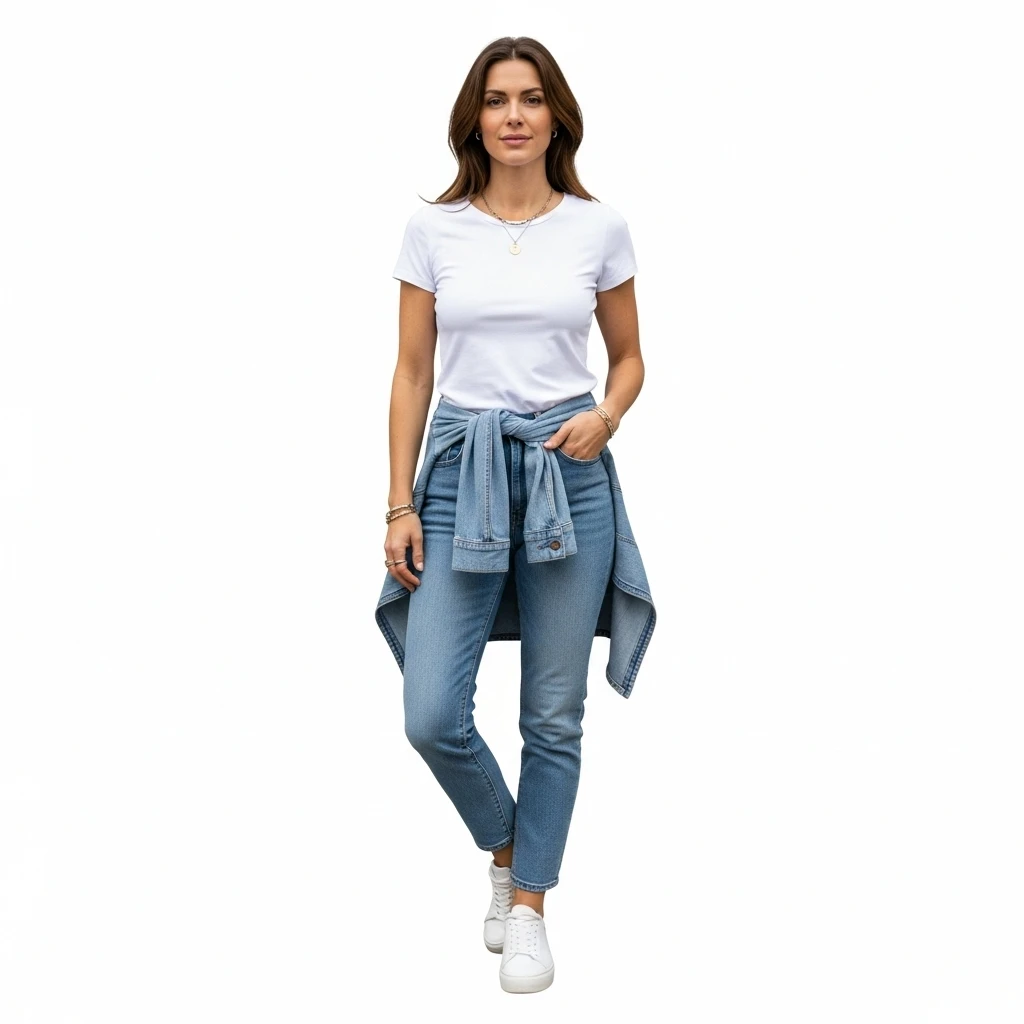 Never underestimate the power of a perfectly fitted white t-shirt paired with well-fitting blue jeans. Add white sneakers, a lightweight cardigan, and a simple gold necklace. This timeless combination works for almost any casual occasion and serves as a perfect base for layering. The versatility of this outfit makes it a wardrobe essential. You can easily transition from day to evening by switching accessories or adding a blazer.