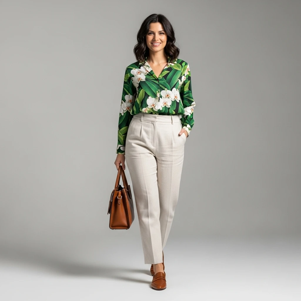 Style a botanical print blouse with neutral linen trousers in cream or tan. Complete the look with brown leather loafers and a structured leather tote. This outfit balances pattern and simplicity beautifully, making it suitable for semi-casual work environments or weekend brunches. Botanical prints connect us to nature and add visual interest without overwhelming an outfit.