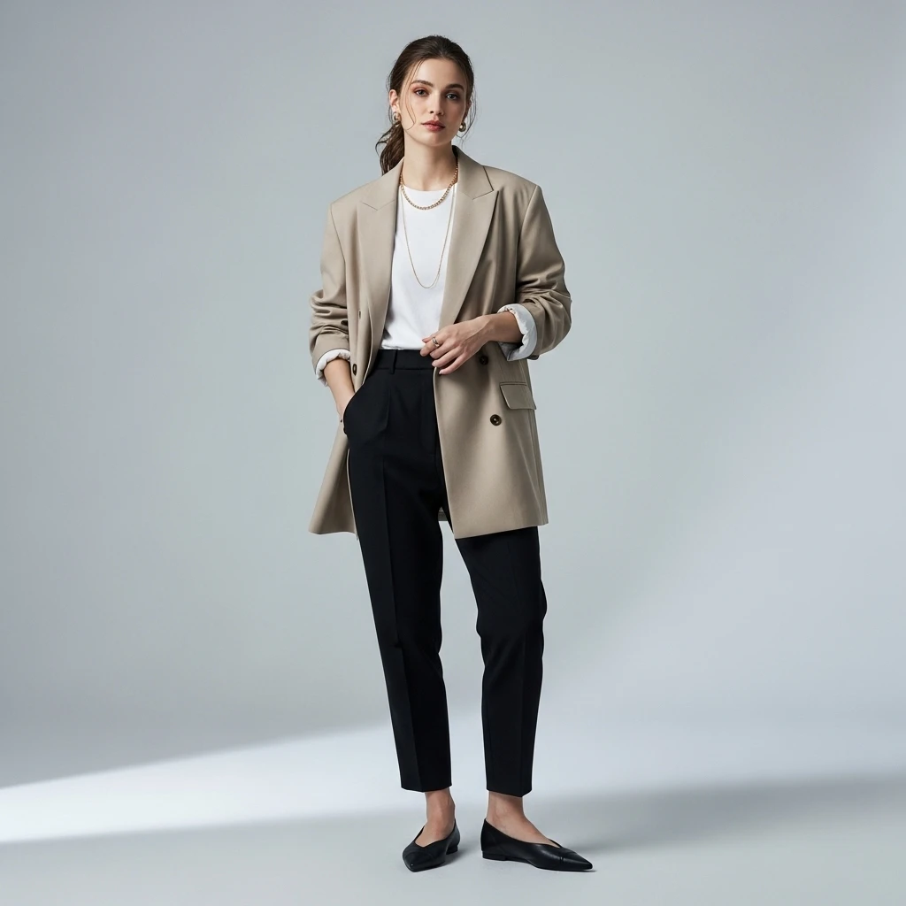 Layer an oversized linen or cotton blazer over a fitted basic tee, paired with tapered trousers in contrasting colors. Add pointed-toe flats and minimal jewelry for an instantly put-together appearance. This silhouette is flattering for most body types and conveys confidence and sophistication. The oversized blazer trend continues strong in 2025 and provides excellent layering options for variable spring temperatures.