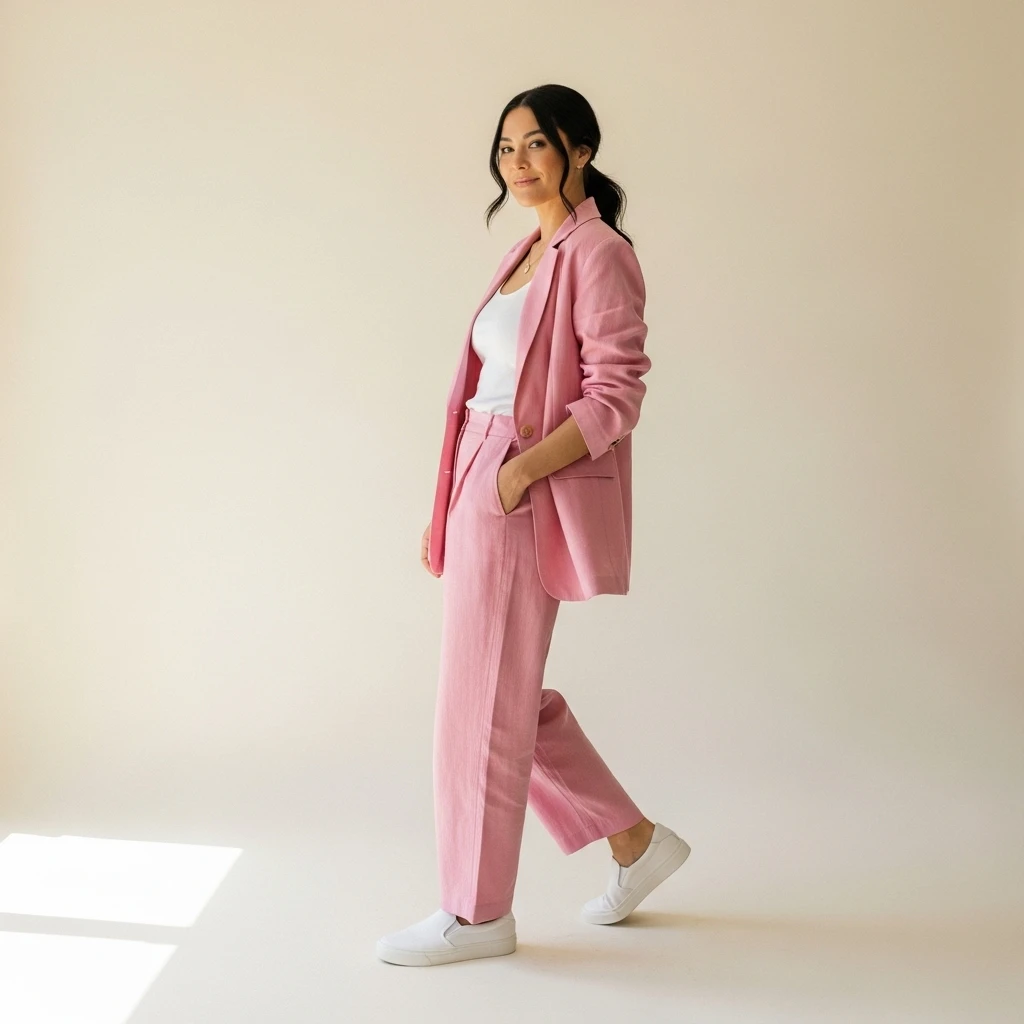 Invest in a linen suit in powder blue, sage green, or blush pink. Wear it with a simple white or cream tank underneath and coordinating slip-on sneakers. This modern take on the power suit is perfect for professional settings or special spring occasions. Linen suits offer breathability and a relaxed elegance that feels appropriate for the season. Pair with minimal jewelry and a sleek, low bun for a polished finish.