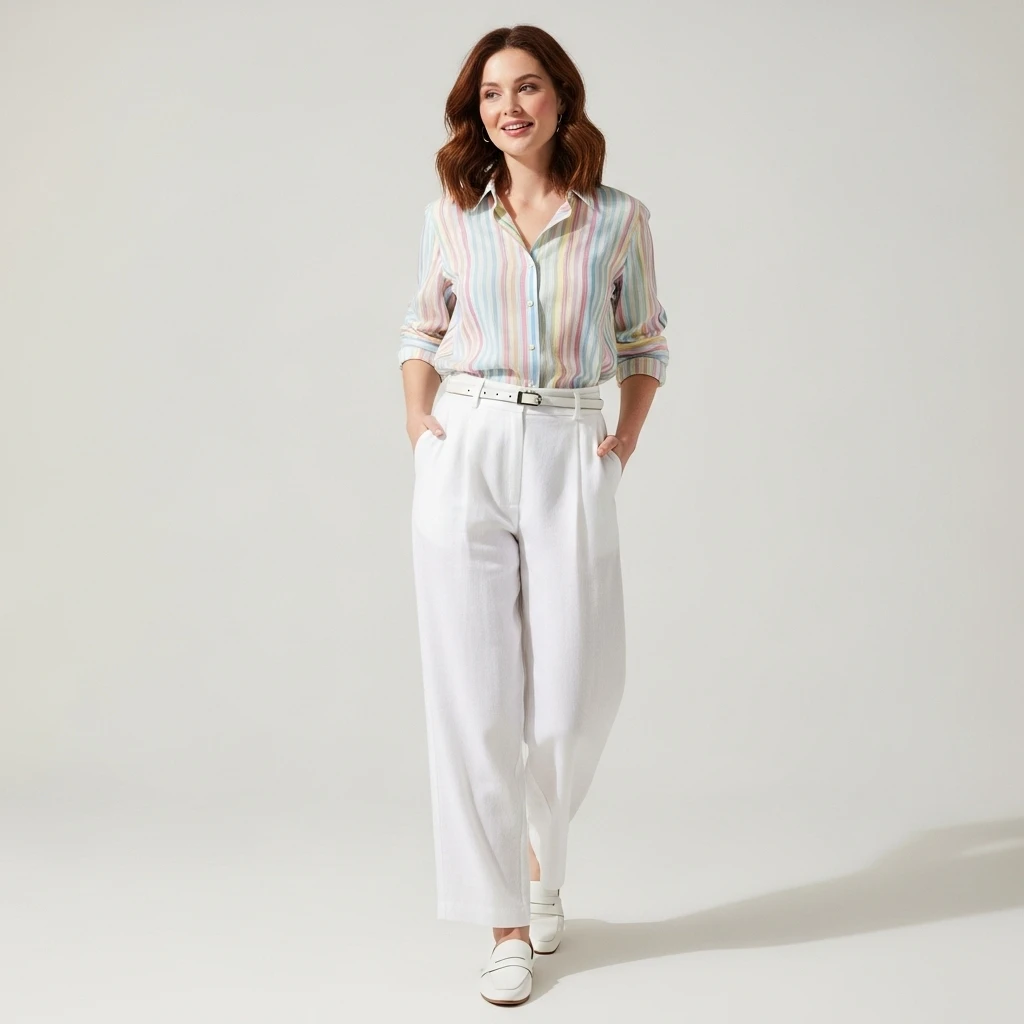 A classic striped button-down shirt paired with high-waisted, wide-leg trousers creates an instantly chic silhouette. Tuck in the shirt, add a delicate belt, and finish with white loafers or Mary Jane flats. This outfit works seamlessly from office to after-work drinks. Stripes in spring often come in pastel color combinations that feel fresh and seasonal.