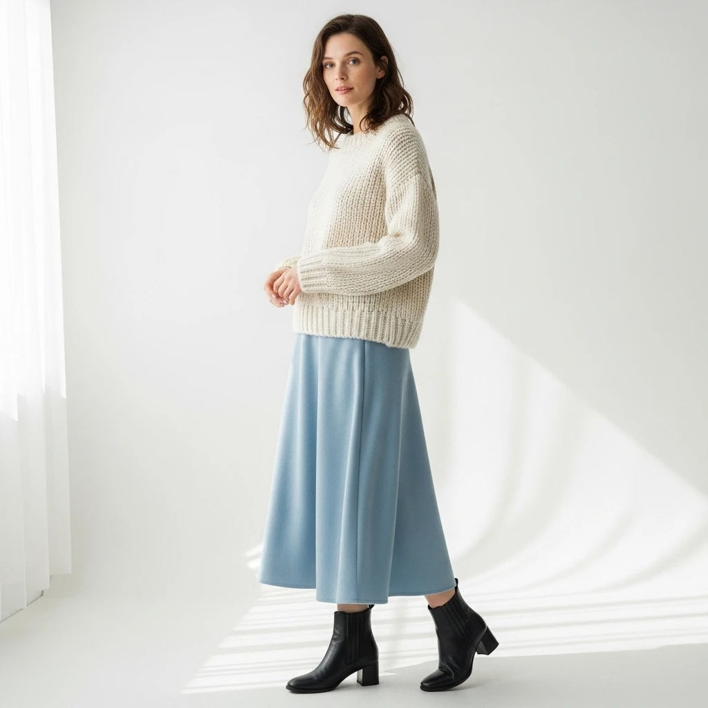 Layer a lightweight knit sweater in cream or soft blue with a midi skirt in a coordinating color or complementary pattern. Add ankle boots or ballet flats to ground the look. This combination provides the perfect amount of coverage while remaining seasonally appropriate. The balanced proportions of a fitted sweater with a flowing skirt create an elegant, timeless appearance.