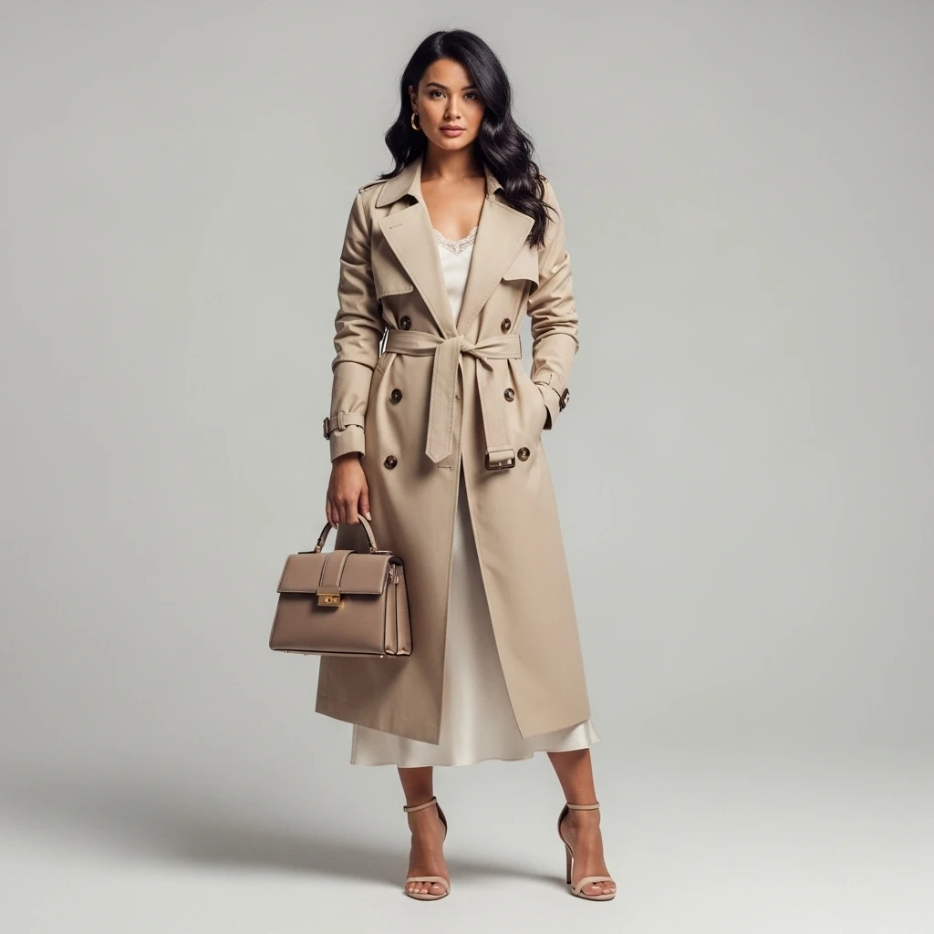 Layer a classic trench coat over a slip dress in silk or satin for an unexpectedly elegant combination. Add pointed-toe flats or heeled sandals and carry a structured handbag. This outfit transitions beautifully from spring’s cooler days to warmer afternoons. The trench coat remains a fashion staple and adds sophistication to any ensemble. This look is particularly versatile for special occasions or upscale casual dining.