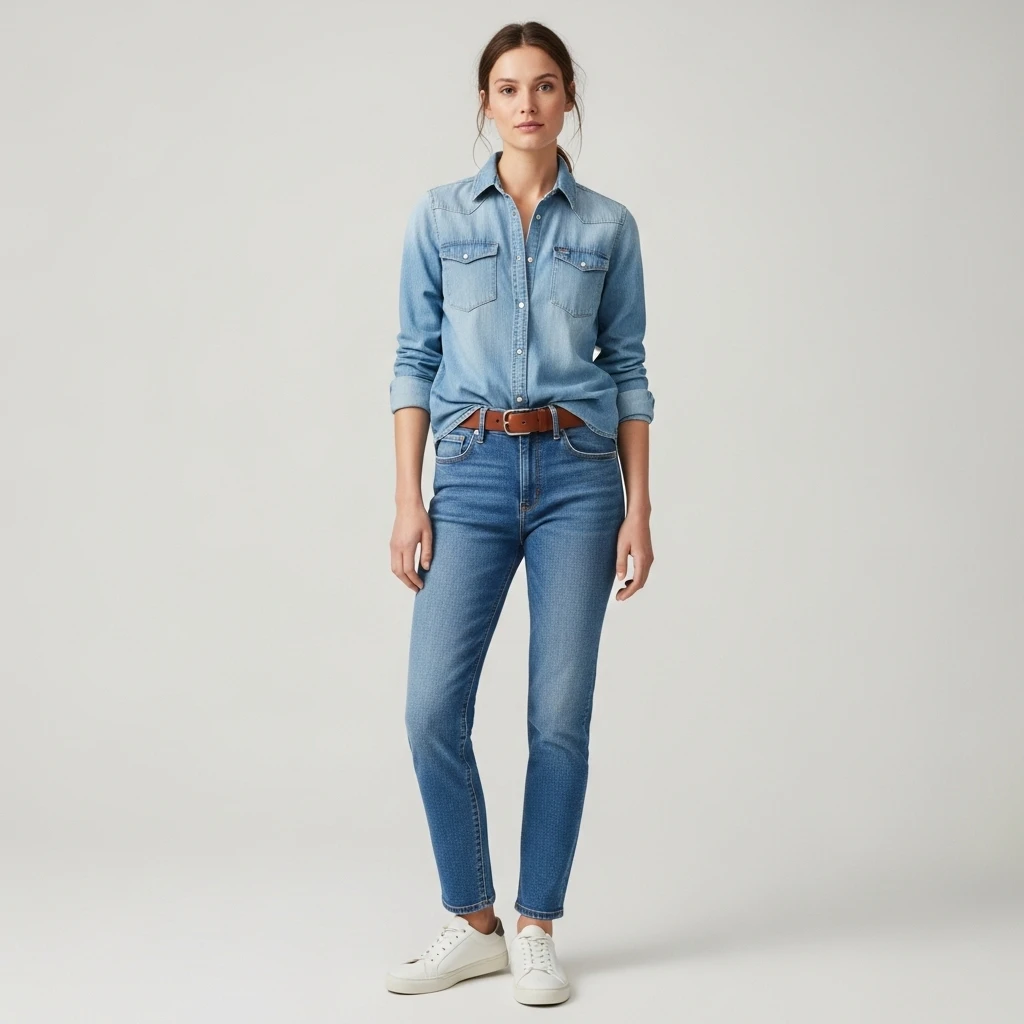 Embrace the denim-on-denim trend by pairing a light-wash denim shirt with medium or dark-wash jeans. Add a structured belt, white sneakers, and simple accessories. This classic combination feels fresh when executed with different wash intensities. Denim on denim works particularly well when you incorporate texture variation, such as combining a smooth shirt with textured jeans.